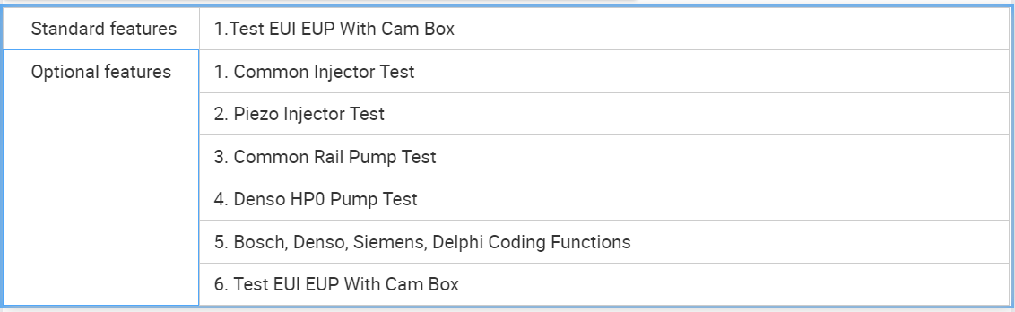 (2) Puede probar inyectores de válvula solenoide o de cristal piezoeléctrico, bombas de alta presión common rail de fabricantes como Bosch, Delphi, Denso, Siemens, Caterpillar, Cummins, aire acondicionado doméstico, Beiyou y aceite pesado. (Nota: Algunas funciones son opcionales).